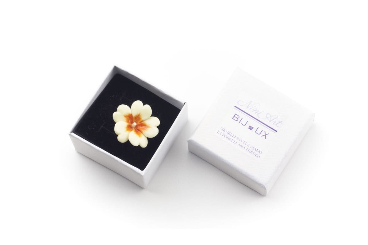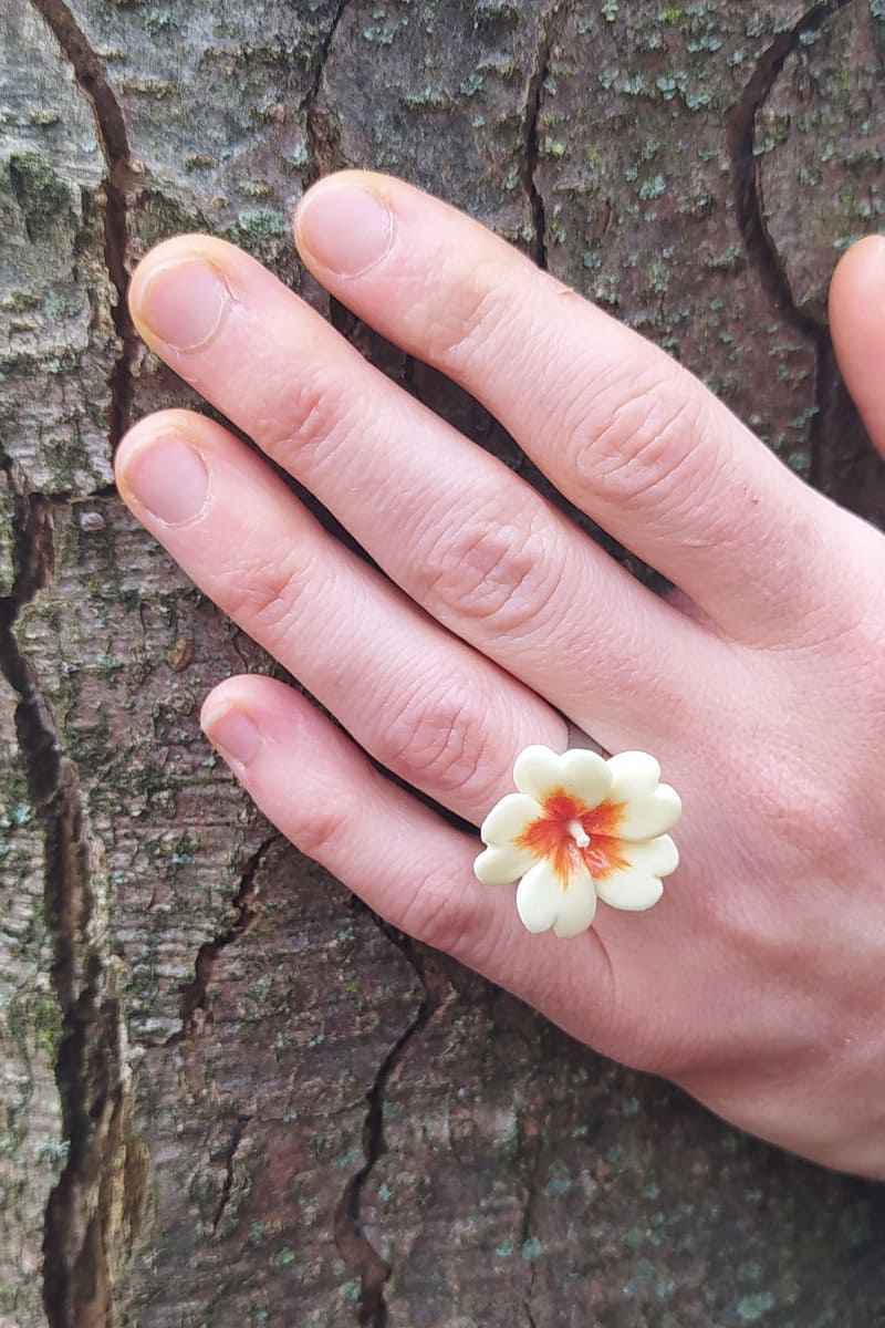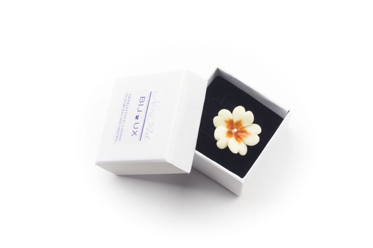 Anello con primula gialla realizzata in porcellana fredda. La base dell’anello è in acciaio ed è regolabile. L’anello viene creato su ordinazione, la primula è interamente realizzata a mano con cura.